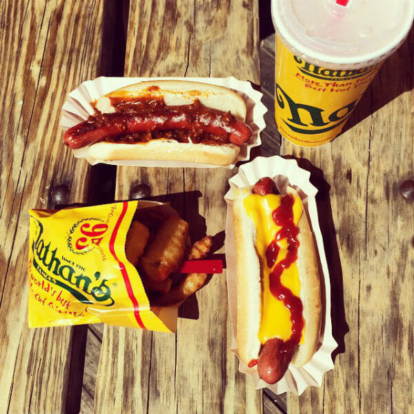 Perritos calientes en Coney Island en Nueva York No puedes marcharte de Nueva York sin probar los mejores perritos calientes de Nathan’s Famous en Coney Island. Este establecimiento especializado en la venta de los famosos hot dogs nació en el año 1916 y parte de su éxito en el momento fue gracias a vestir a sus empleados como médicos, transmitiendo la idea que comer una salchicha era en realidad algo saludable.