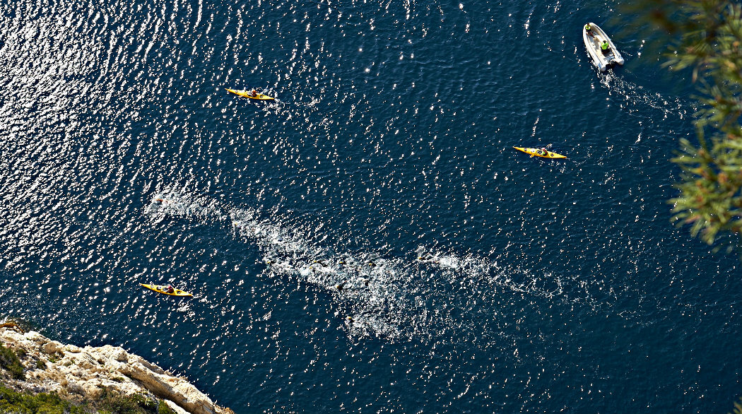 La primera ronda fue para los nadadores más experimentando, que tenían por delante una travesía de 7km desde Aiguablava hasta Sa Riera. Pasando por el Cap de Begur, que siempre es un tramo difícil. Durante la travesía, entre los impresionantes paisajes desde la costa, pudieron nadar entre las rocas, disfrutar del agua cristalina y del fondo marino.