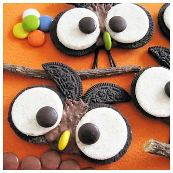 Separa las capas de las galletas Oreo con cuidado para que la galleta no se rompa. Una vez separadas, usa como ojos dos partes de galleta con la crema, y une con cuidado con un poco de crema de chocolate, hasta que se peguen por completo. Parte por la mitad las galletas que han quedado sin crema, ya que serán las orejas-pluma de los búhos. Una vez que tengamos la estructura del búho completa, solo nos queda decorar los ojos y el pico. Para ello, usa lacasitos de colores.
