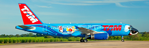 TAM, una de las compañías aéreas líderes en Brasil se ha unido a la promoción de la película Rio decorando uno de sus A320 con la imagen de Blu, el protagonista.
