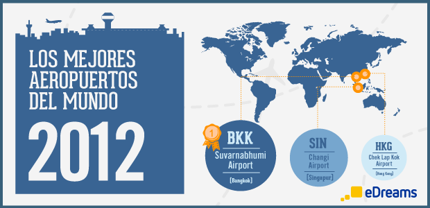 ¿Te gustan las curiosidades, los datos y siempre quieres conocer más y más? eDreams acaba de publicar el ranking de los Mejores Aeropuertos del mundo 2012, un estudio elaborado con las opiniones de miles de clientes recogidas durante el pasado año. En cada aeropuerto los usuarios evaluaron varios aspectos como los servicios ofrecidos, la variedad de tiendas, restaurantes, bares y las zonas de espera.