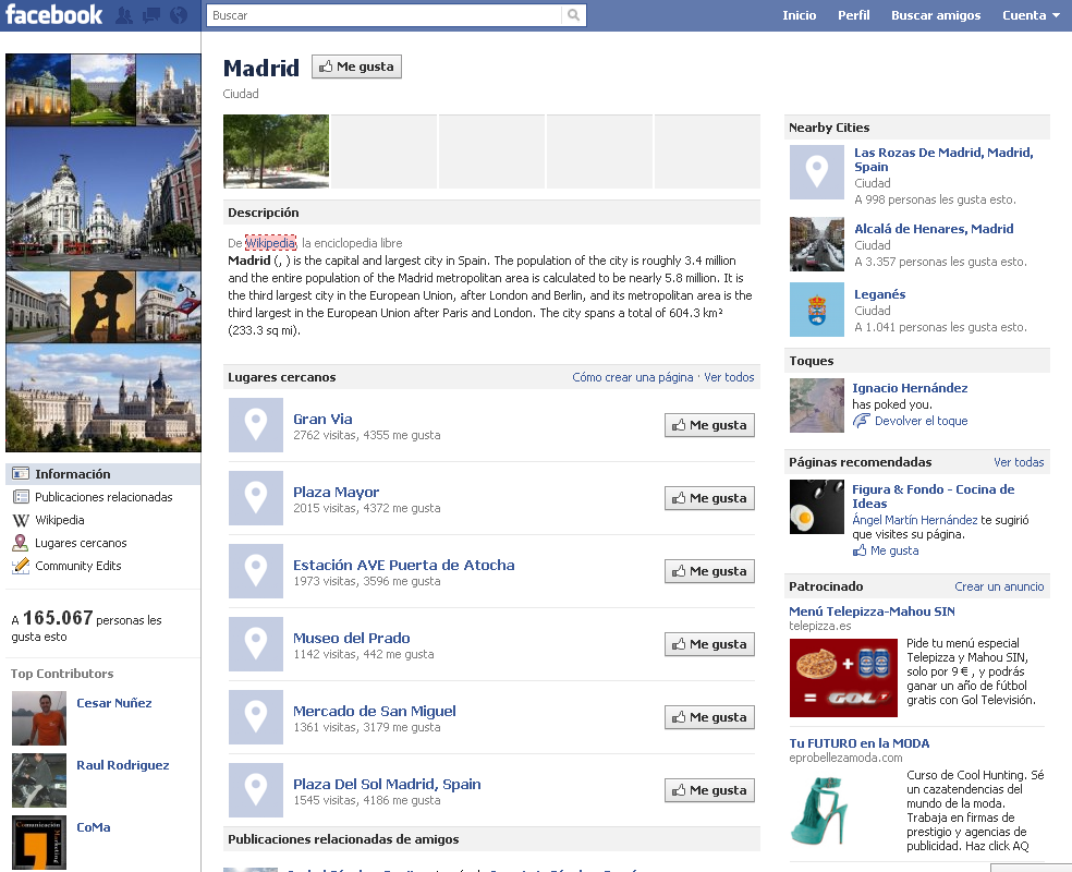 De esta manera, Madrid es la décima ciudad del mundo con mayor número de usuarios en la red social, con 5,9 millones de seguidores, por delante de Nueva York, la capital más internacional del mundo, que ocupa el decimocuarto puesto con 4, 2 millones de usuarios según datos de la página web Social Bakers, que recopila información demográfica de Facebook en 200 países y la actualiza a diario.