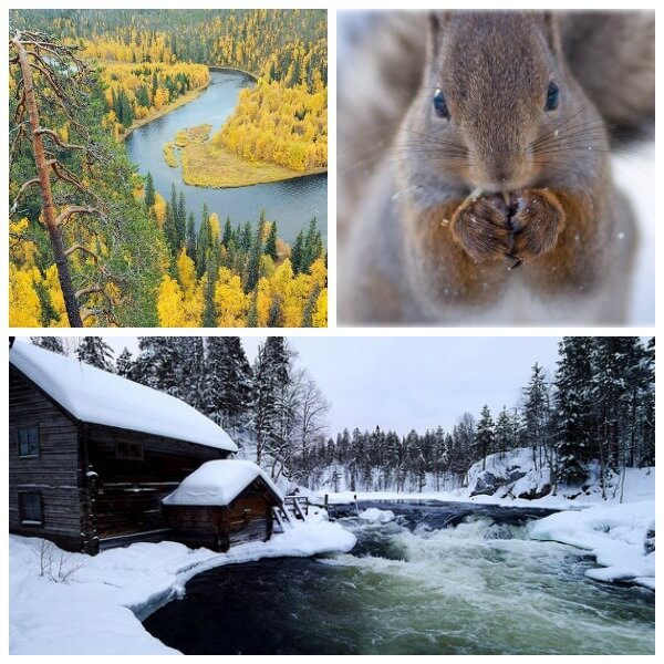 El Parque Nacional de Oulanka, en la parte norte de Finlandia, cambia de aspecto con las estaciones, pero la espectaculidad de sus paisajes se mantiene durante todo el año. Estas tierras, que se extienden a lo largo de 270 km cuadrados, fueron habitadas hasta el siglo XVII y desde 1956 son consideradas espacio protegido. Aquí viven más de 500 especies vegetales, centenares de pájaros distintos, ardillas, osos y linces, entre otros animales. Durante el verano, se pueden ver numerosas mariposas en la orilla del río y el paseo se puede convertir en una ruta para recoger setas o frutos rojos.