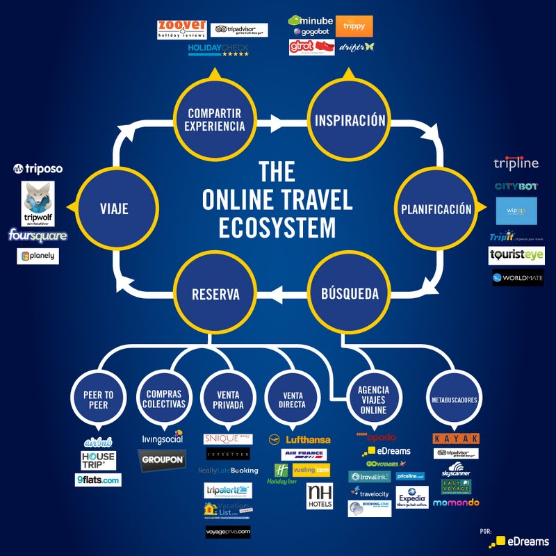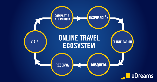 eDreams recoge en este estudio las diferentes etapas en las que un usuario interviene al realizar una compra online de un viaje y algunos de los principales agentes que intervienen dentro del mismo sistema.