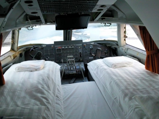 Edificio con forma de avión. El interior está amueblado con algunos elementos originales como máscaras de oxígeno, asientos de business class y la suite es una cabina de piloto.