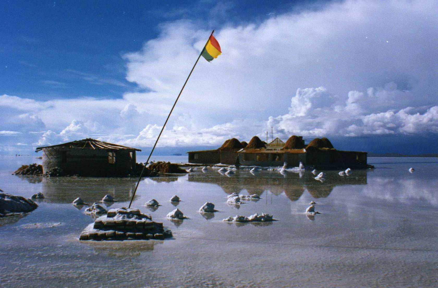 Está construido íntegramente con sal: sillas, camas, etc … Además, ofrece una vista excepcional de la salina  de Uyuni, Bolivia.