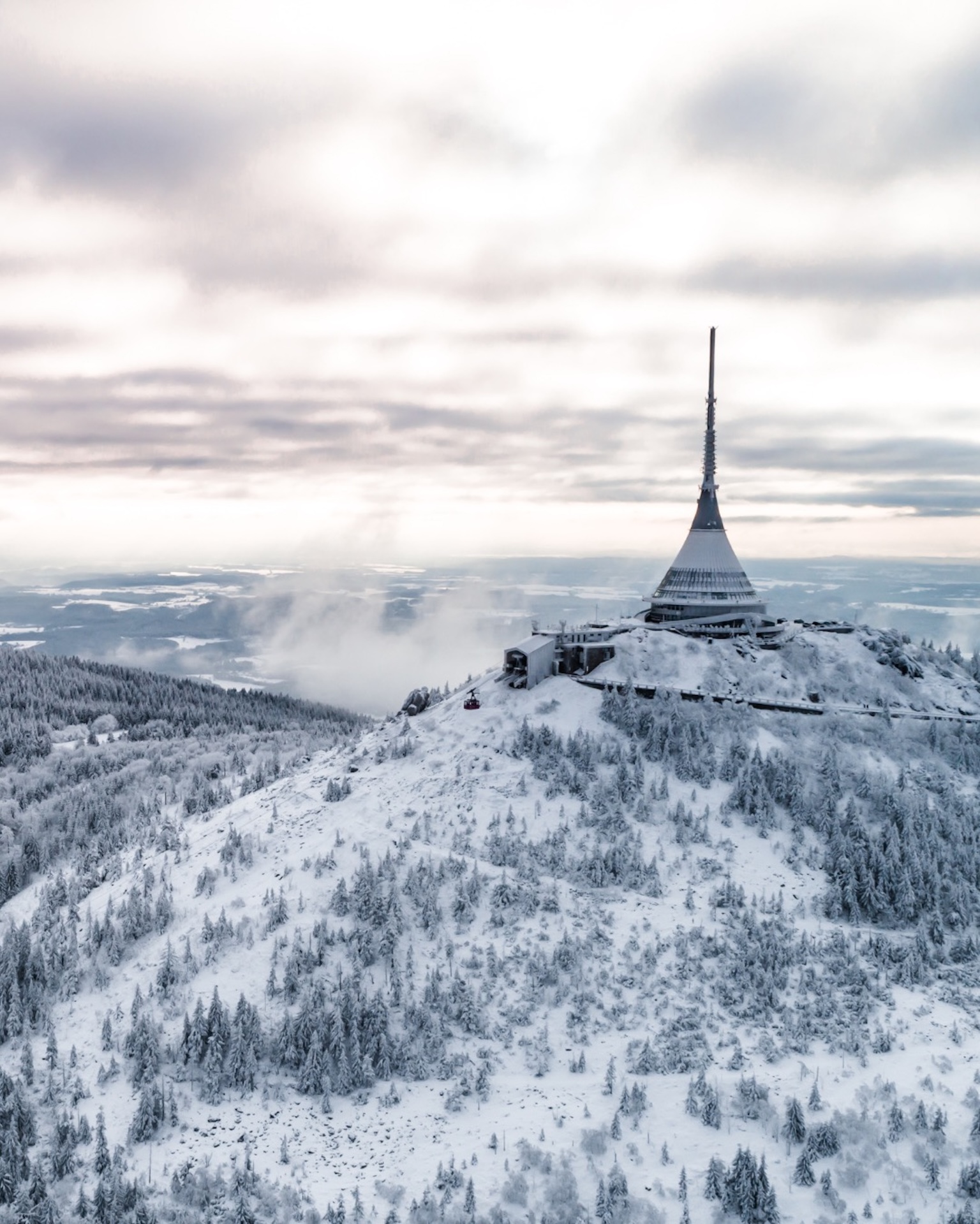Desde allí, en pocos minutos puedes llegar al monte Ještěd, coronado por la futurista torre Ještěd. Da un paseo corto para disfrutar de vistas panorámicas sobre un paisaje nevado digno de una bola de nieve.