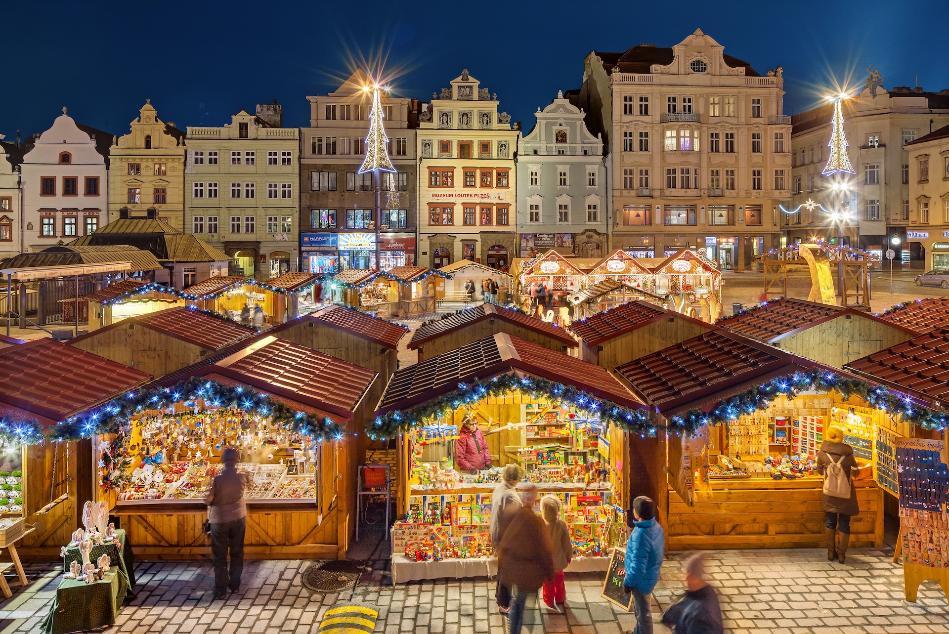 Plzeň, cuna de la famosa cerveza Pilsner, celebra la Navidad a lo grande. Su plaza principal, Náměstí Republiky, se llena de casetas de madera con decoraciones artesanales, velas y dulces locales. La catedral gótica de San Bartolomé domina el horizonte y su torre ofrece vistas espectaculares del mercado.